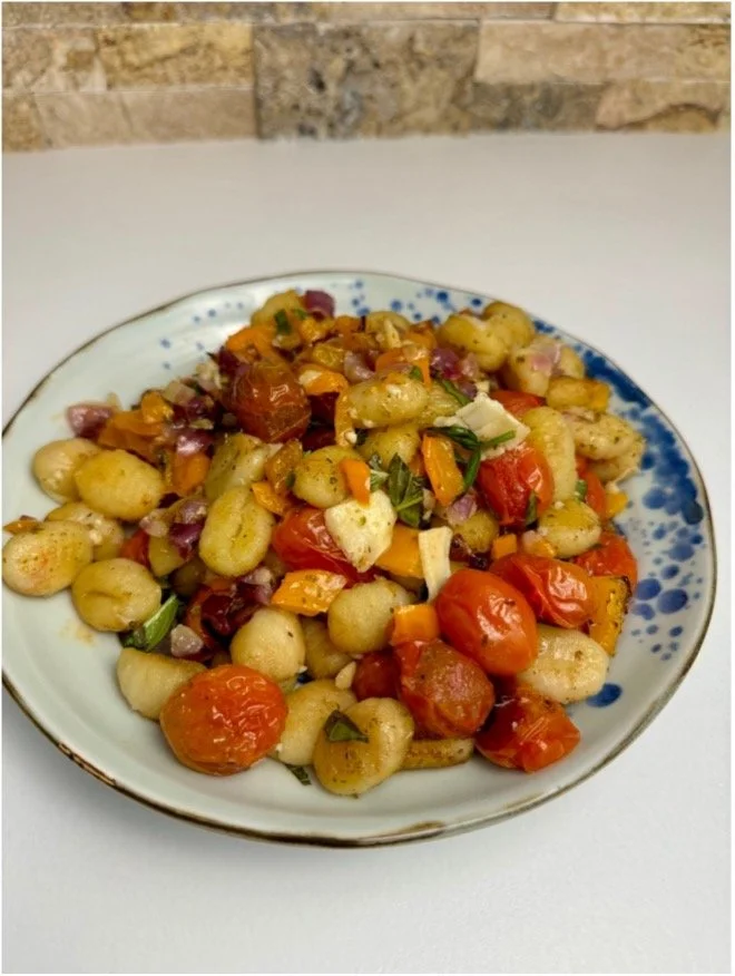 Preheat oven to 400. Line a large baking sheet with foil. Place the gnocchi, bell pepper, onion, and tomatoes on sheet. Toss with olive oil and spices until fully coated. Bake for 25 minutes. Serve with a drizzle of balsamic glaze, cheese, and basil.